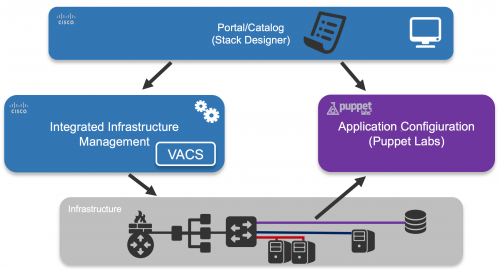 The portal is integrated with the ‘Infrastructure Management’ block, UCS Director, using its rich set of Restful APIs. As part of Cisco Enterprise Cloud Suite (CECS) we have done the integration work with UCS Director and the artefact repository for scripts, images and executables. In this example Puppet is used to provide the configuration management functionality in Stack Designer.