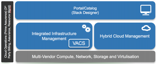 The top building block, that I have labelled as the portal/catalogue, is an easy and simple user interface (or Restful API if required) for ordering services and life-cycle management of the assets available to the end user. It allows seamless design and deployment of complete application stacks. As you would expect with a catalogue it is highly customisable allowing you to alter the look and feel as well as integrating with other tools that are not part of the suite.