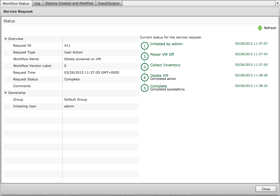 Well you can, below is an example that will call a workflow that powers off the select VM and then deletes it (to delete a VM in VMware it must first be powered off). Combining these steps can speed things up for certain types of users.