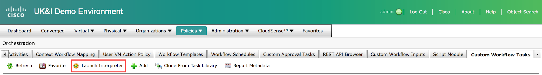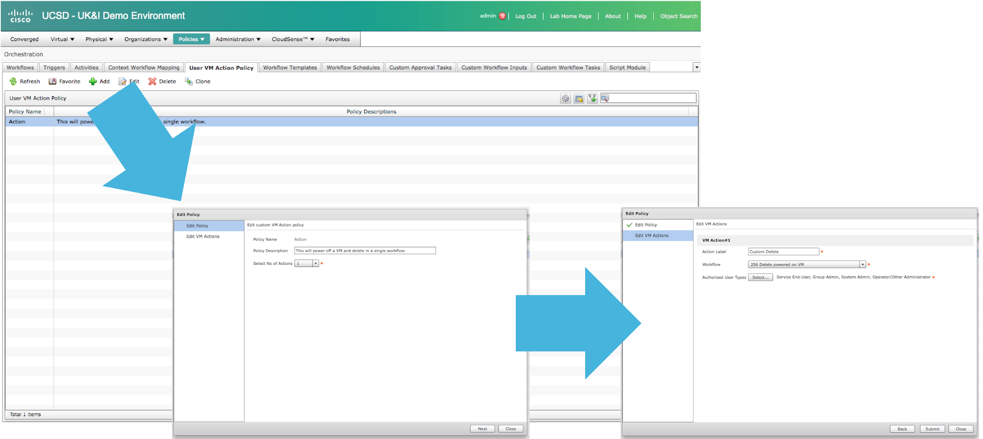 You can then create the ‘button’ via the ‘Policies>Orchestration>User VM Action Policy’. This allows you to define 1 or more sets of action buttons in a policy that can then be applied to a VDC.