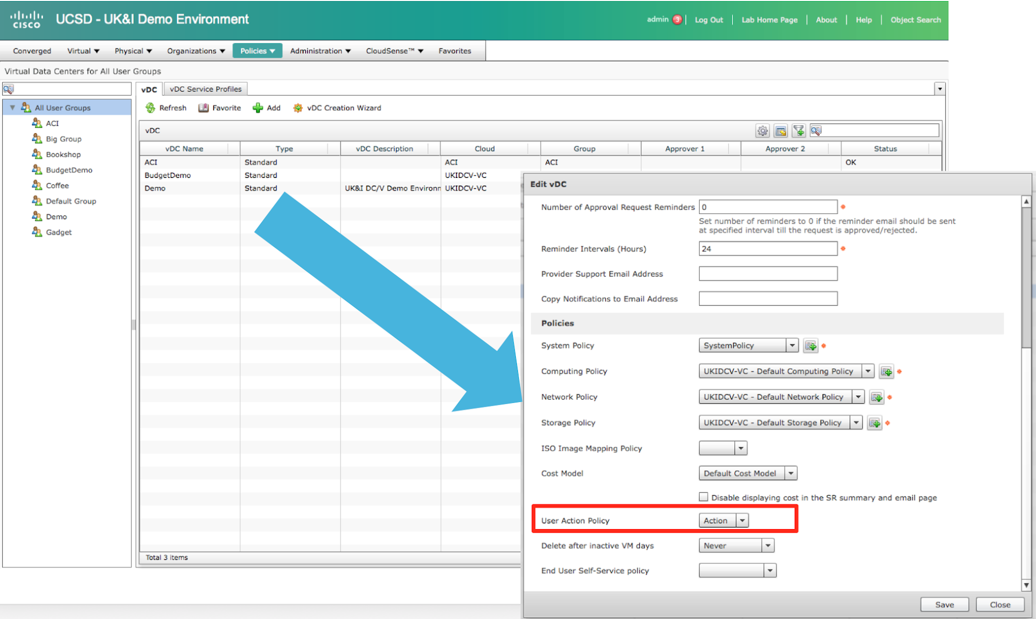 Once you have created the policy assign it to the VDC(s) in question as the ‘User Action Policy’ drop down.
