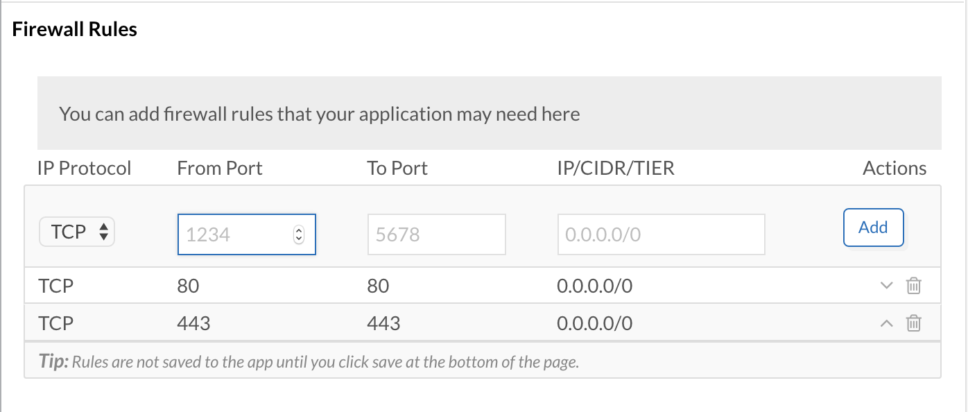 Once the ‘firewall’ rules have been configured these will be used when the application is deployed to automatically configure security (based on the capabilities of the target destination, uses features like AWS security groups or Cisco ACI etc.).