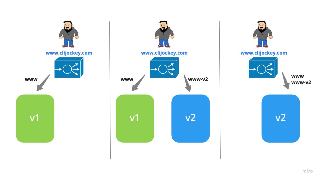 This strategy is probably one of the most widely used, it has one version (say green) deployed along side a second version (say blue), however all user traffic is directed to one version. Once the second version, blue, has been evaluated, tested and you are happy it’s time to take production workloads the traffic gets switched reducing downtime.