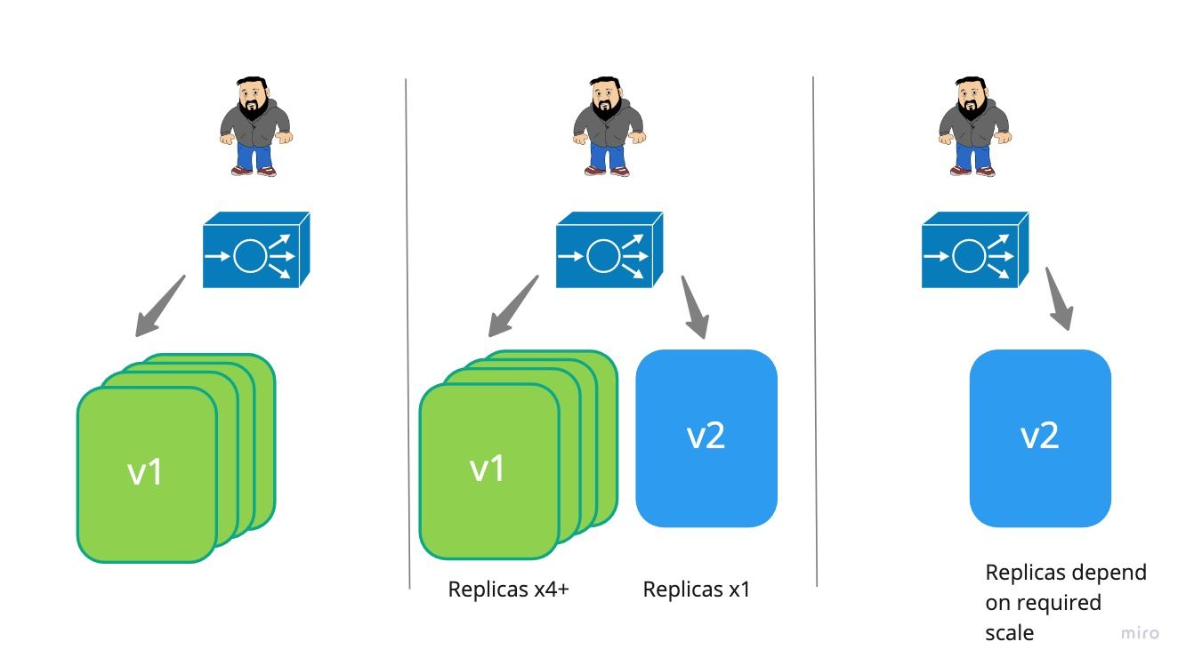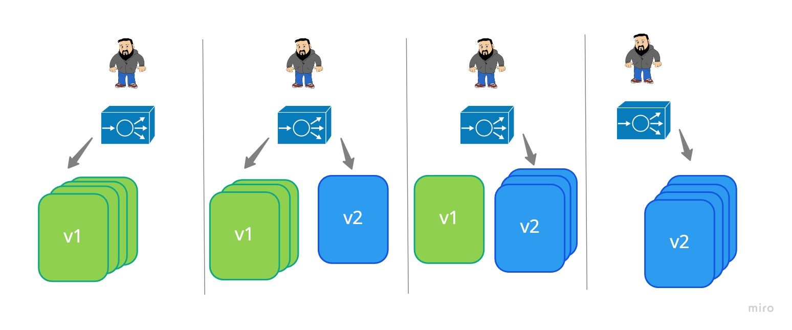Altering the traffic weight so that all traffic goes to the new version or in case of issue all back to the old version resulting in only a small proportion of the user base being impacted. The rollout can take time while monitoring is done.