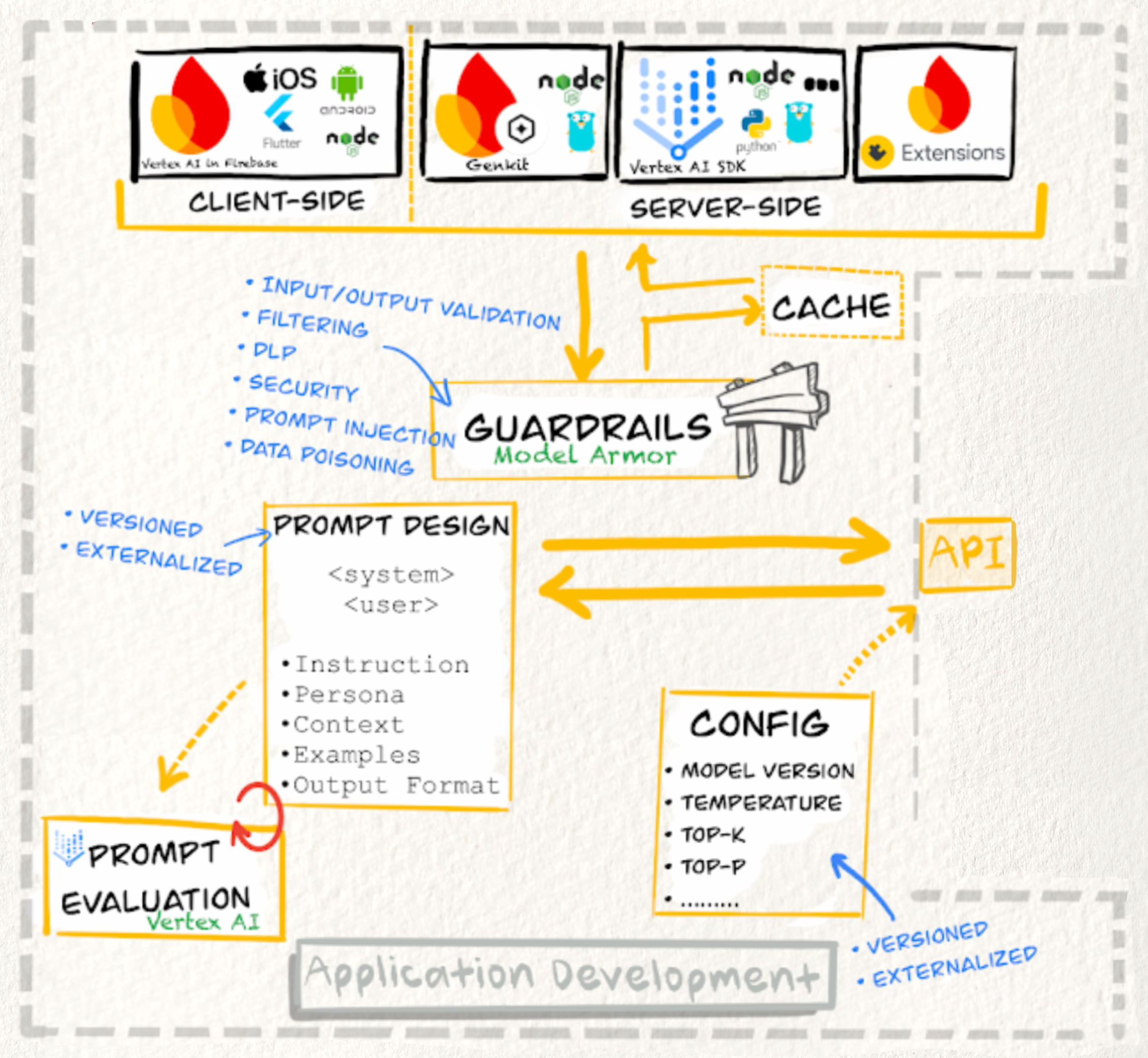 On the client-side, we’re often dealing with user interfaces (like iOS apps or web browsers) where users interact with our GenAI features. This is where SDKs like Vertex AI, Genkit, and Firebase Extensions come into play. Choosing the right SDK is like picking the perfect grinder — you need one that matches your beans and brewing style. Nobody wants a chunky espresso, right? These SDKs offer a guided onboarding experience, making it easier to build, deploy, and monitor AI features directly within your applications.